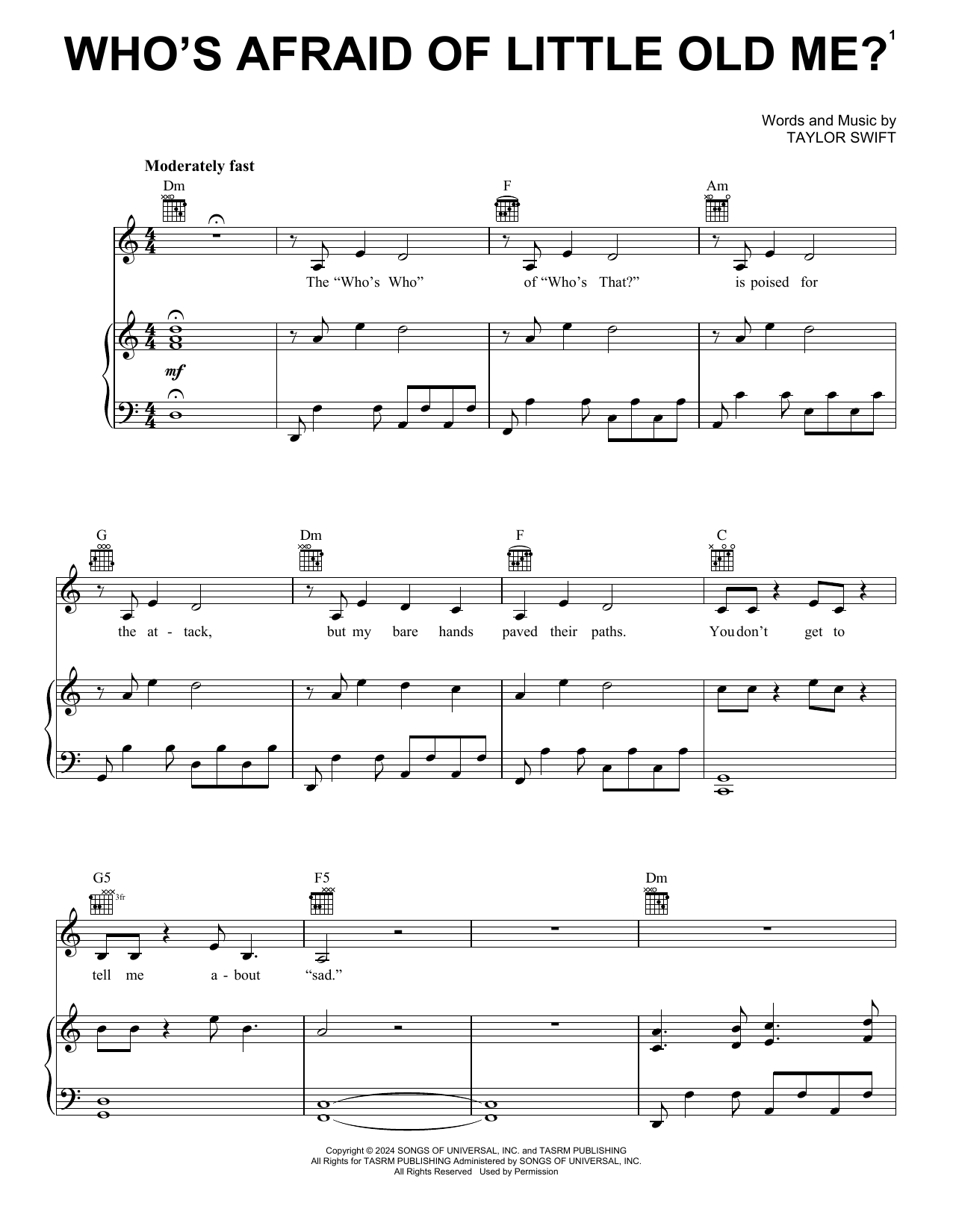 Download or print Taylor Swift Who's Afraid of Little Old Me? sheet music, chords and digital score arranged for 5-Finger Piano. This Pop score includes 3 page(s).
