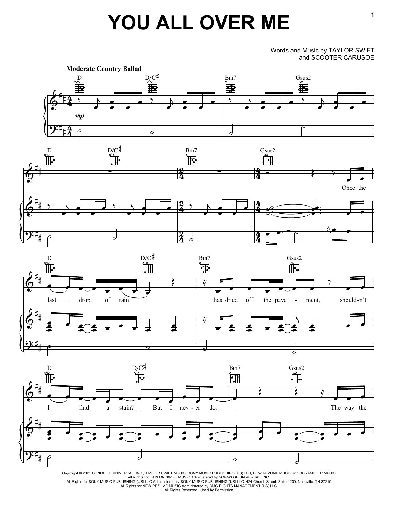 Download or print Taylor Swift You All Over Me (feat. Maren Morris) (Taylor's Version) (From The Vault) sheet music, chords and digital score arranged for Easy Piano. This Country score includes 7 page(s).