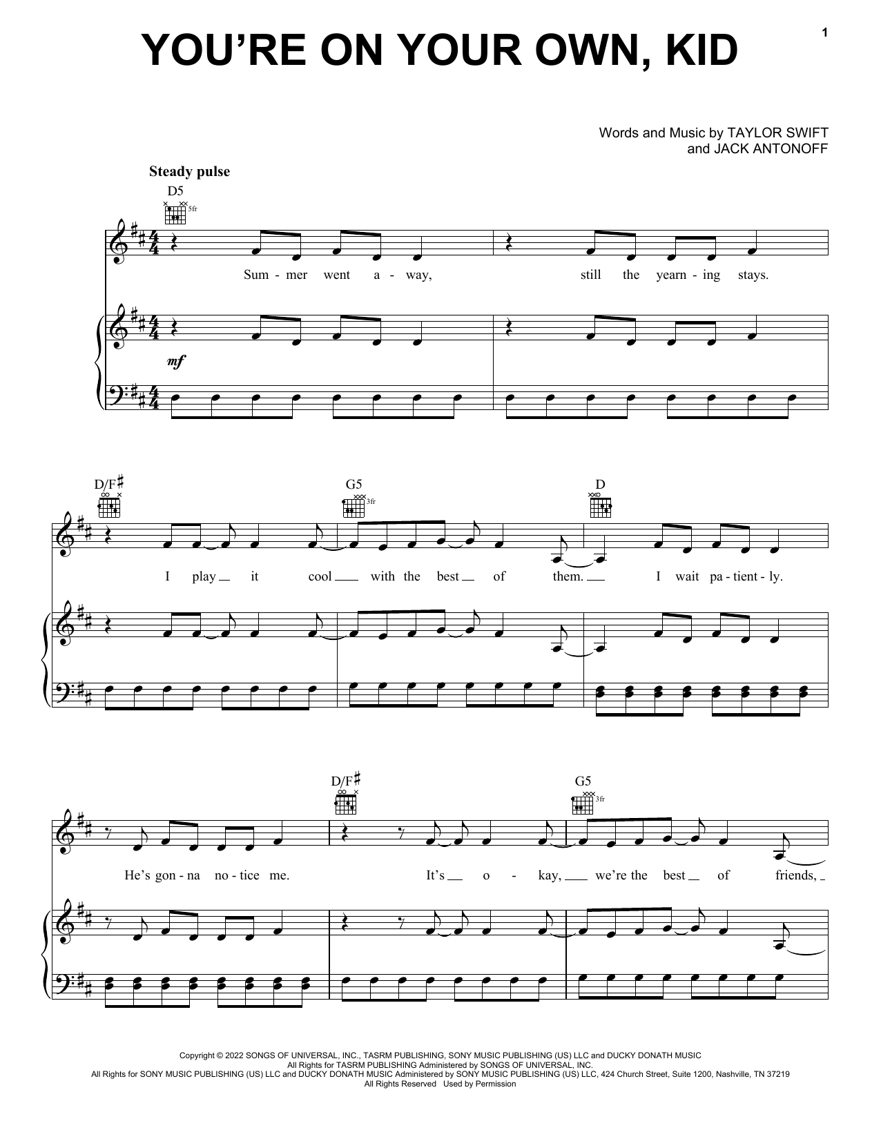 Download or print Taylor Swift You're On Your Own, Kid sheet music, chords and digital score arranged for Easy Piano. This Pop score includes 6 page(s).