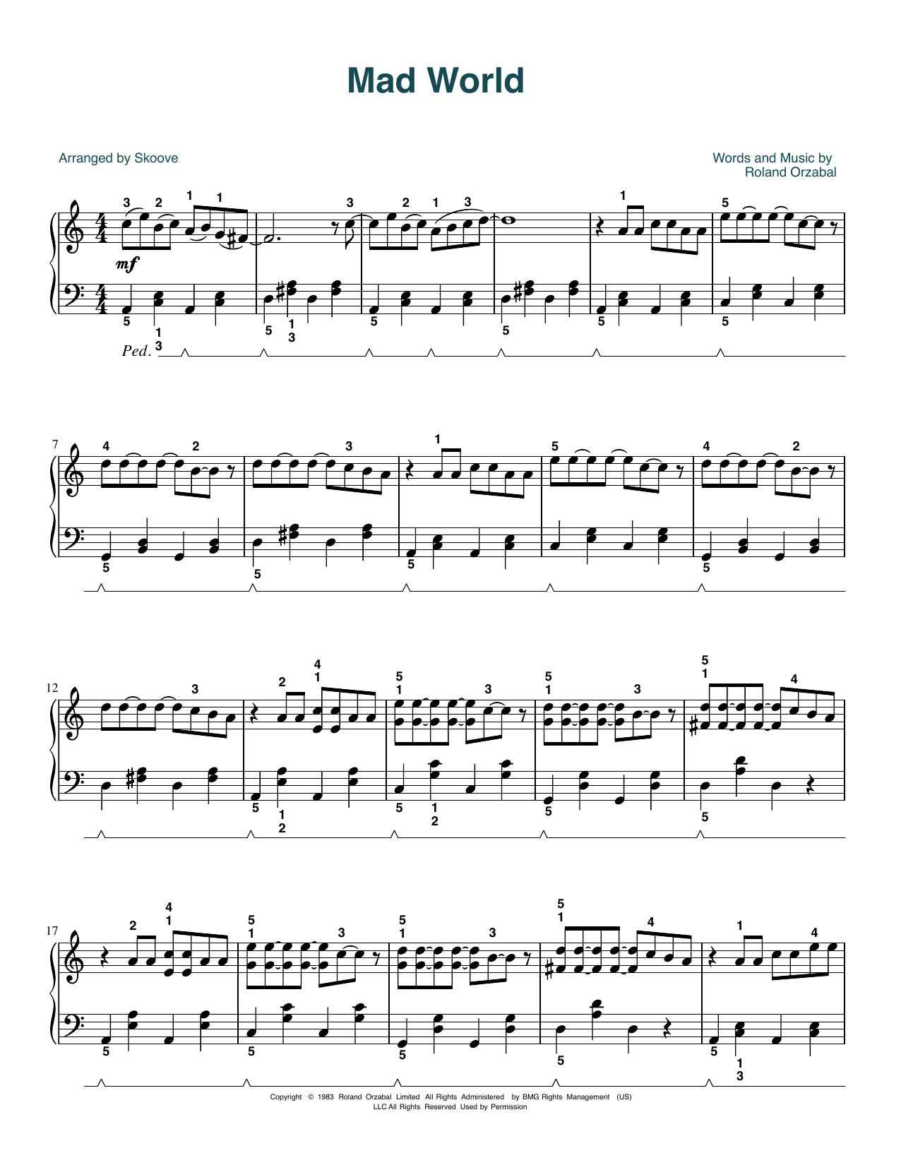 Download or print Tears For Fears Mad World (arr. Skoove) sheet music, chords and digital score arranged for Easy Piano. This Pop score includes 2 page(s).