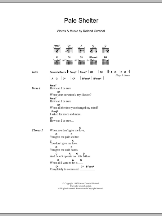 Download or print Tears for Fears Pale Shelter sheet music, chords and digital score arranged for Guitar Chords/Lyrics. This Pop score includes 3 page(s).