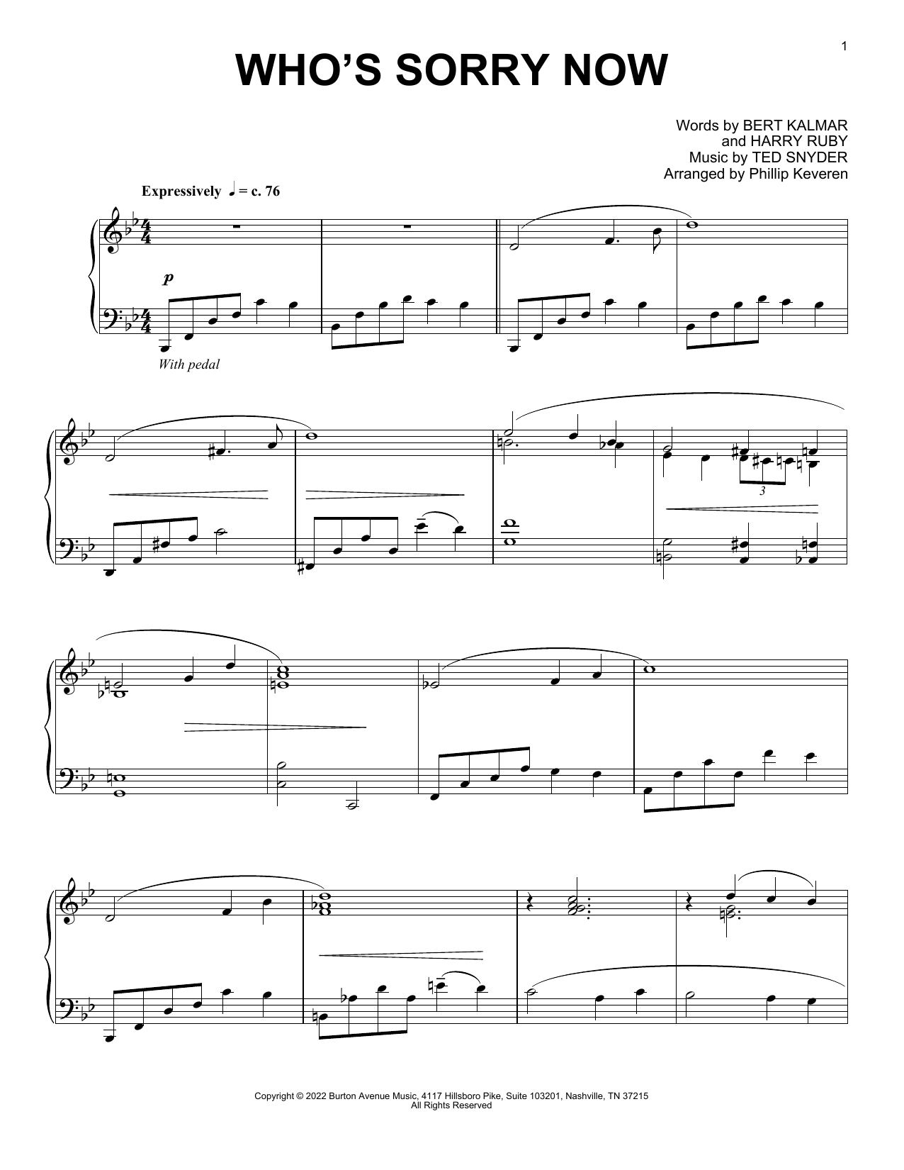 Download or print Ted Snyder Who's Sorry Now (arr. Phillip Keveren) sheet music, chords and digital score arranged for Piano Solo. This Jazz score includes 4 page(s).