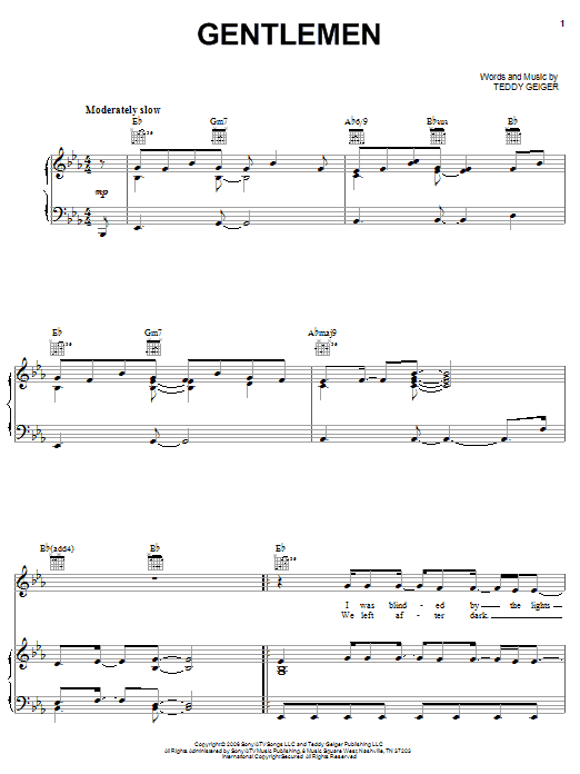 Download or print Teddy Geiger Gentlemen sheet music, chords and digital score arranged for Piano, Vocal & Guitar Chords (Right-Hand Melody). This Pop score includes 6 page(s).