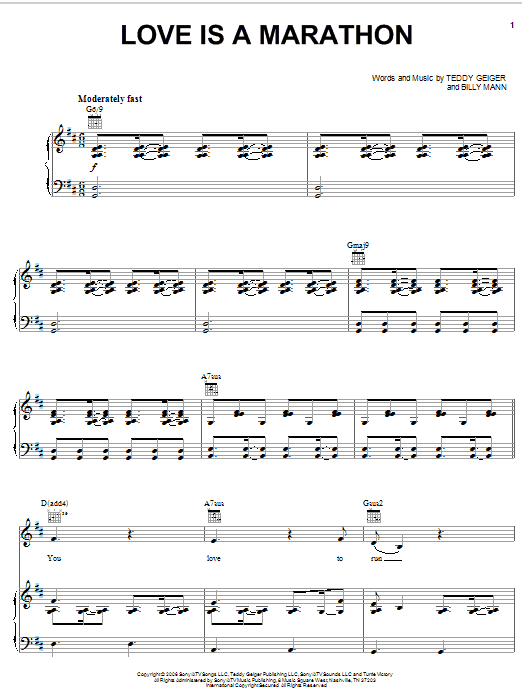 Download or print Teddy Geiger Love Is A Marathon sheet music, chords and digital score arranged for Piano, Vocal & Guitar Chords (Right-Hand Melody). This Pop score includes 8 page(s).