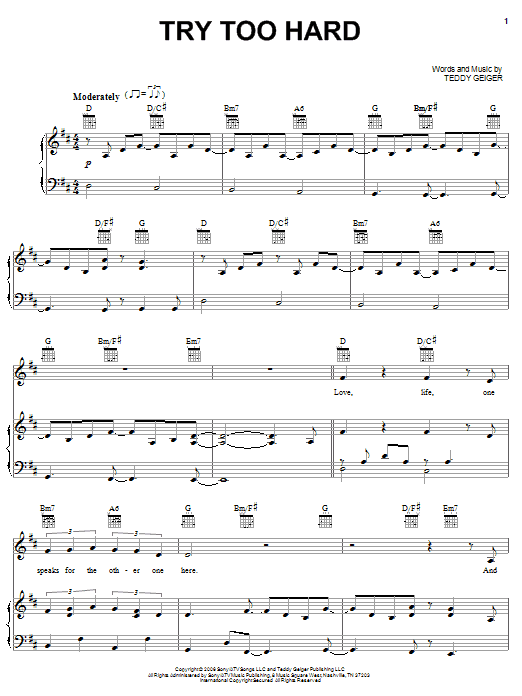 Download or print Teddy Geiger Try Too Hard sheet music, chords and digital score arranged for Piano, Vocal & Guitar Chords (Right-Hand Melody). This Pop score includes 7 page(s).