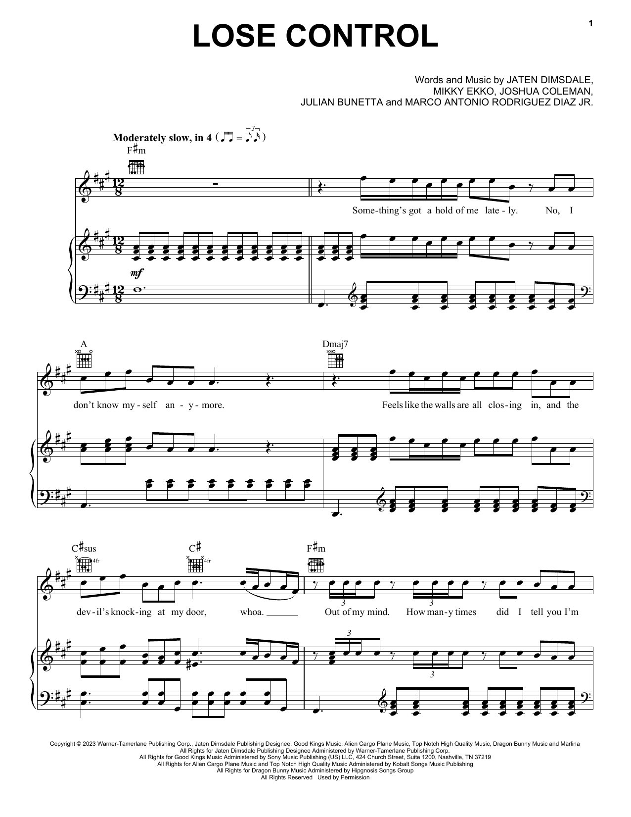 Download or print Teddy Swims Lose Control sheet music, chords and digital score arranged for Easy Piano. This Pop score includes 6 page(s).