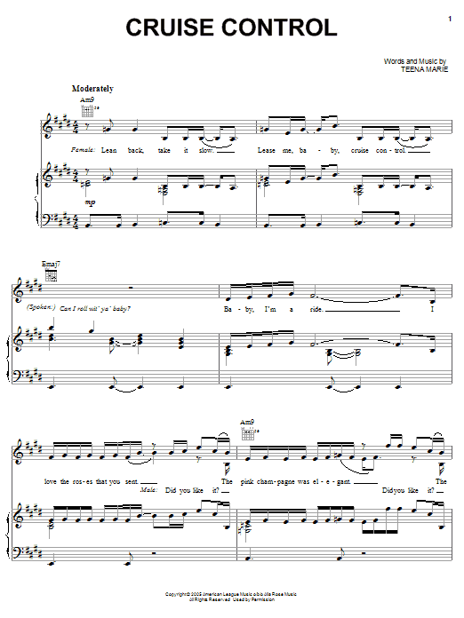 Download or print Teena Marie Cruise Control sheet music, chords and digital score arranged for Piano, Vocal & Guitar Chords (Right-Hand Melody). This Pop score includes 10 page(s).