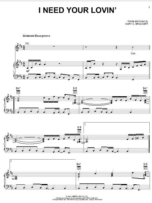 Download or print Teena Marie I Need Your Lovin' sheet music, chords and digital score arranged for Piano, Vocal & Guitar Chords (Right-Hand Melody). This Disco score includes 8 page(s).