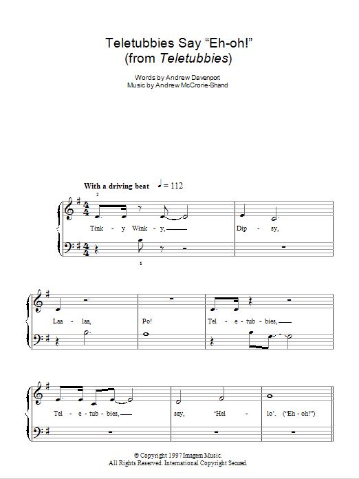Download or print Andrew Davenport Teletubbies Say "Eh-oh!'" sheet music, chords and digital score arranged for Piano, Vocal & Guitar Chords. This Film/TV score includes 5 page(s).