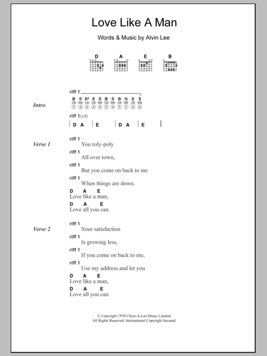 Download or print Ten Years After Love Like A Man sheet music, chords and digital score arranged for Guitar Chords/Lyrics. This Rock score includes 2 page(s).