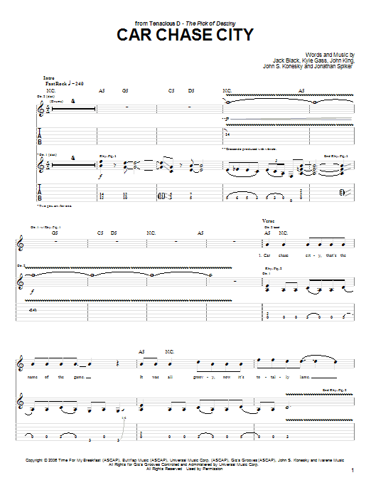 Download or print Tenacious D Car Chase City sheet music, chords and digital score arranged for Guitar Tab. This Film/TV score includes 6 page(s).
