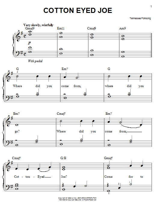 Download or print Tennessee Folksong Cotton Eyed Joe sheet music, chords and digital score arranged for Easy Piano. This Country score includes 2 page(s).