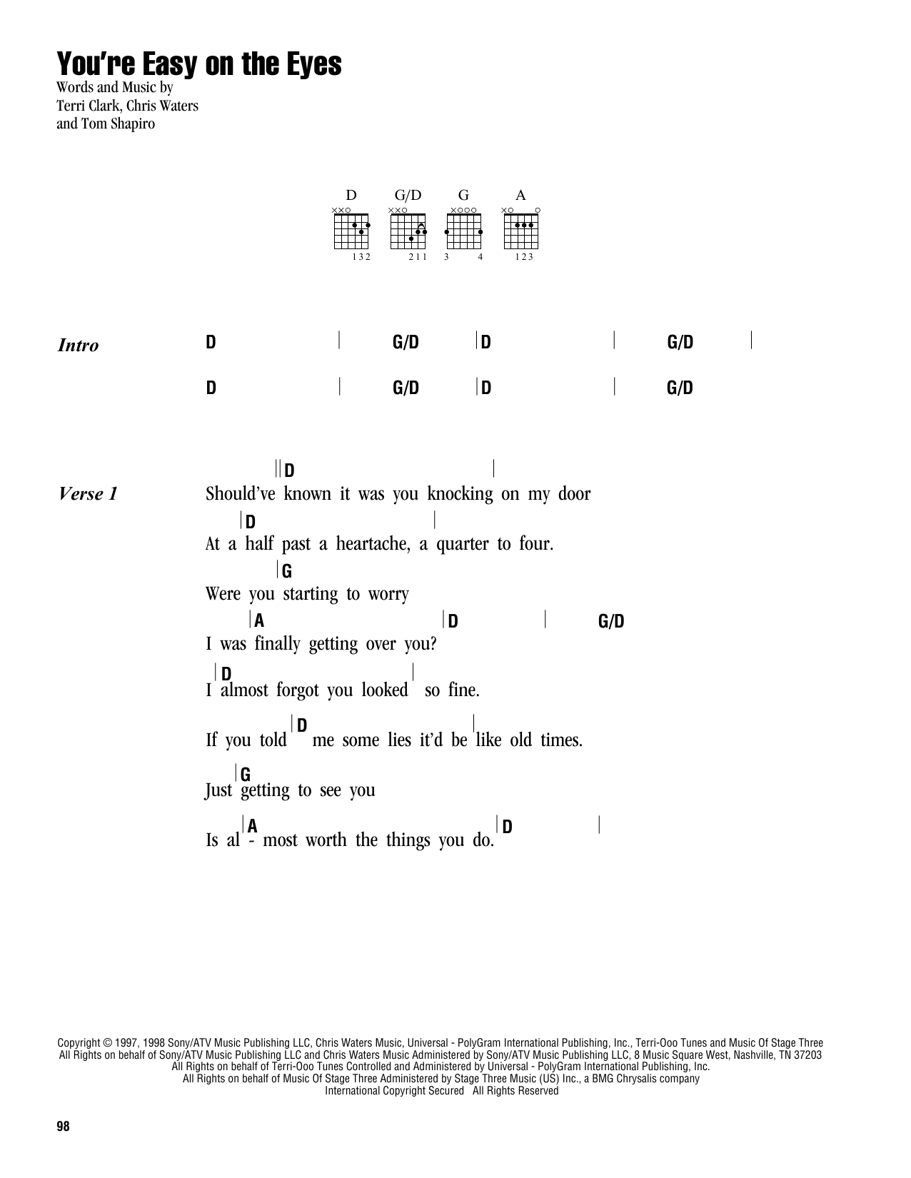 Download or print Terri Clark You're Easy On The Eyes sheet music, chords and digital score arranged for Piano, Vocal & Guitar Chords (Right-Hand Melody). This Country score includes 4 page(s).
