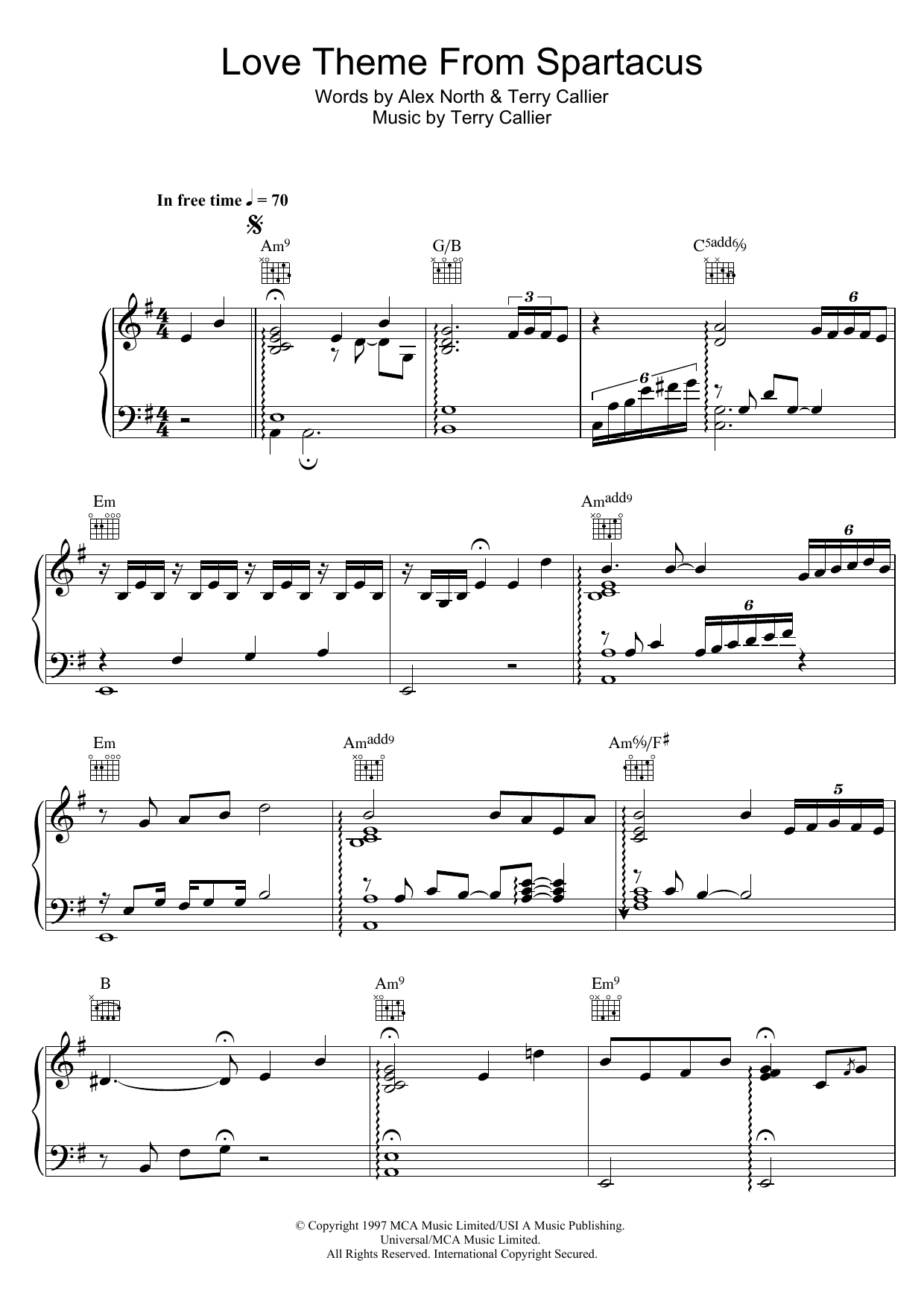 Download or print Terry Callier Love Theme From Spartacus sheet music, chords and digital score arranged for Piano, Vocal & Guitar Chords. This Soul score includes 4 page(s).