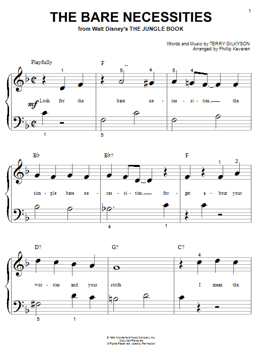 Download or print Terry Gilkyson The Bare Necessities (arr. Phillip Keveren) sheet music, chords and digital score arranged for Big Note Piano. This Children score includes 3 page(s).
