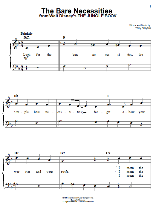 Download or print Terry Gilkyson The Bare Necessities (from The Jungle Book) sheet music, chords and digital score arranged for Piano Solo. This Children score includes 3 page(s).