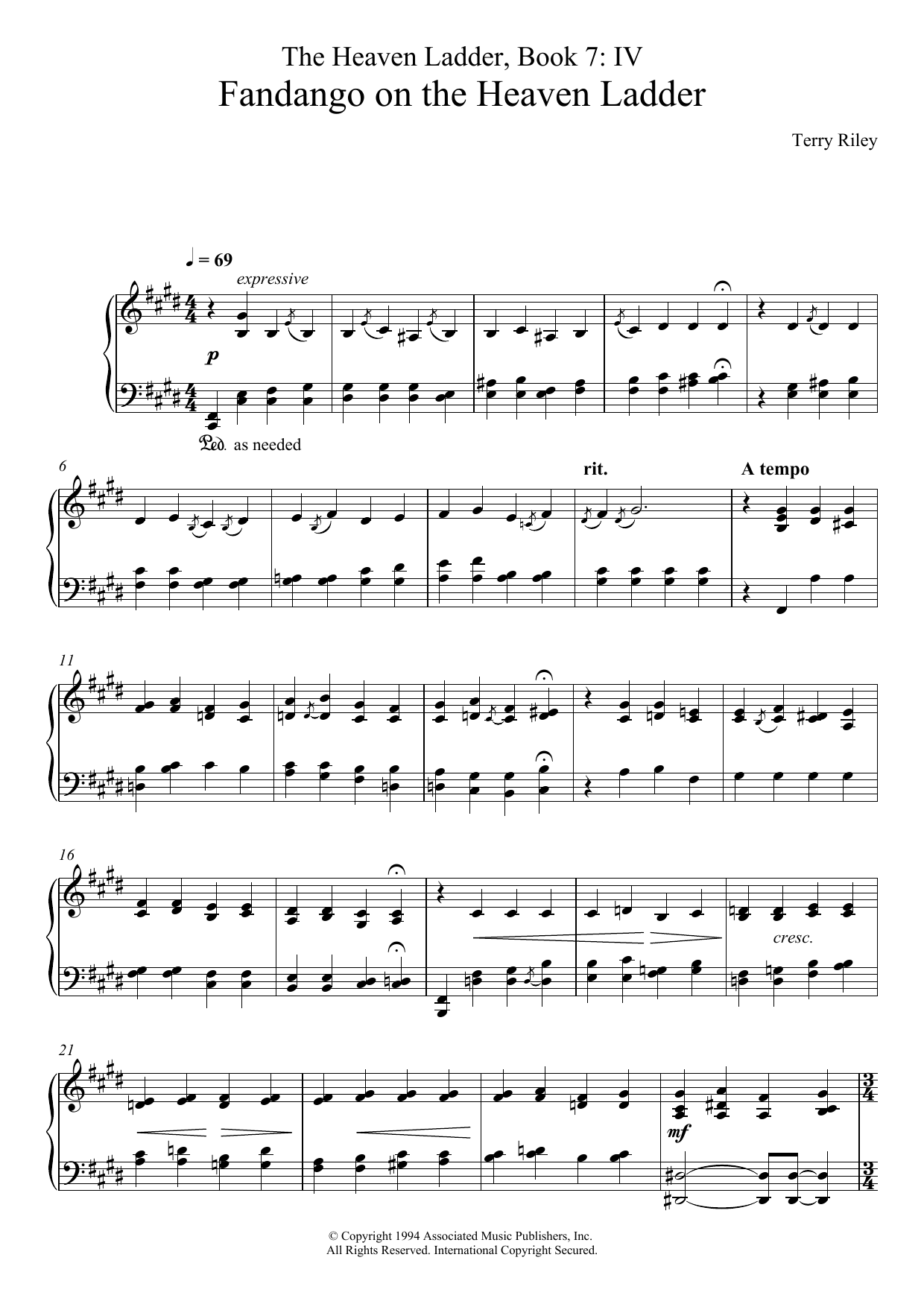 Download or print Terry Riley Fandango On The Heaven Ladder (No.4 From The Heaven Ladder Book 7) sheet music, chords and digital score arranged for Piano Solo. This Classical score includes 17 page(s).