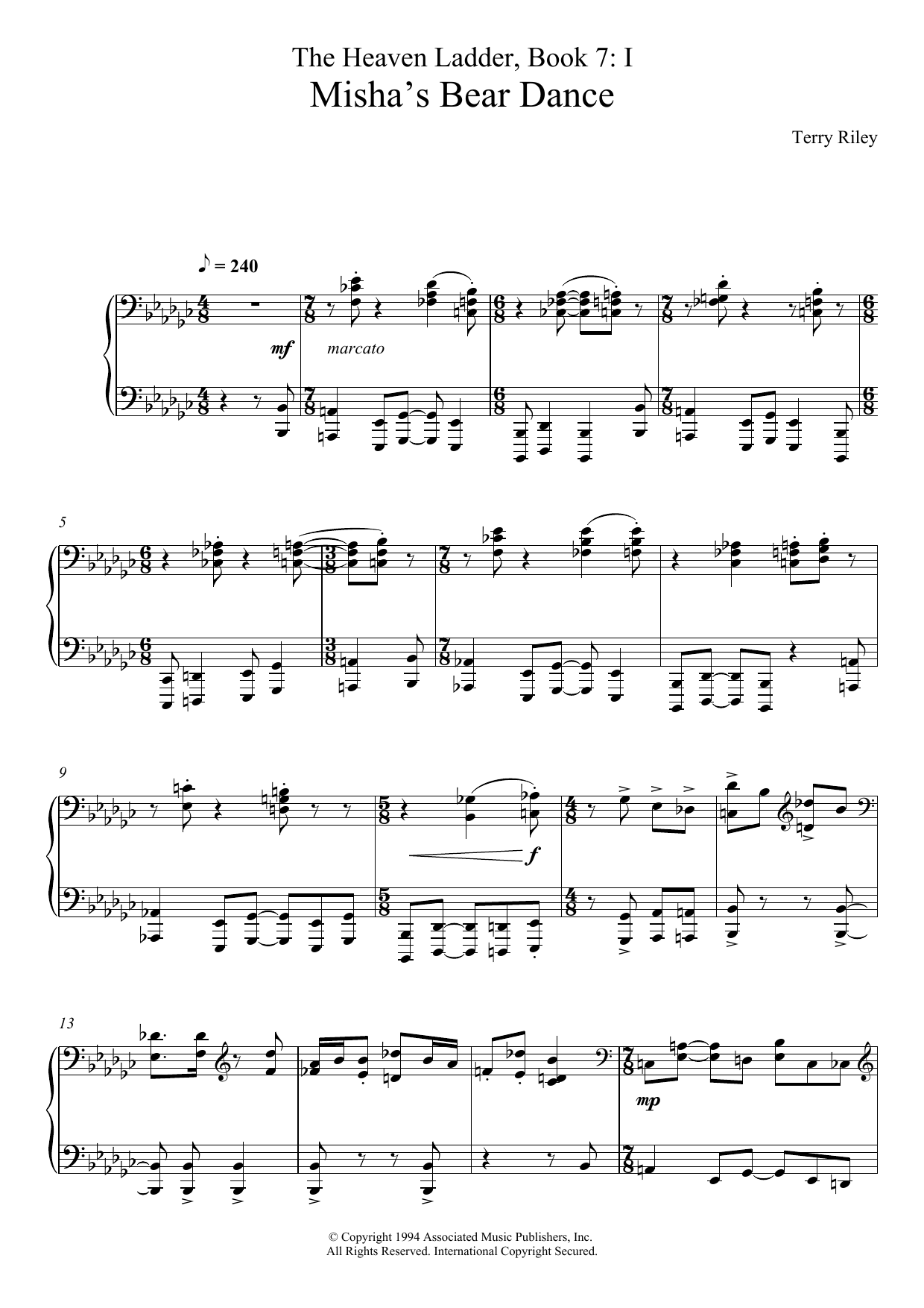 Download or print Terry Riley Misha's Bear Dance (No.1 From The Heaven Ladder Book 7) sheet music, chords and digital score arranged for Piano Solo. This Classical score includes 5 page(s).