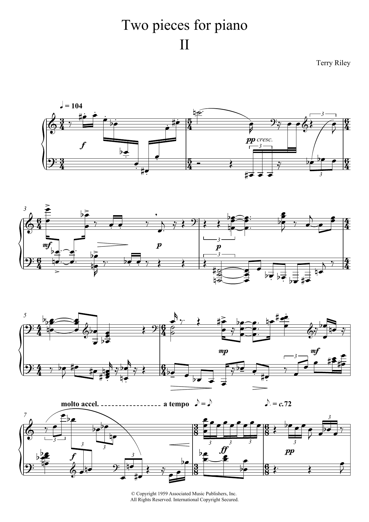 Download or print Terry Riley Two Pieces For Piano - II. sheet music, chords and digital score arranged for Piano Solo. This Classical score includes 8 page(s).