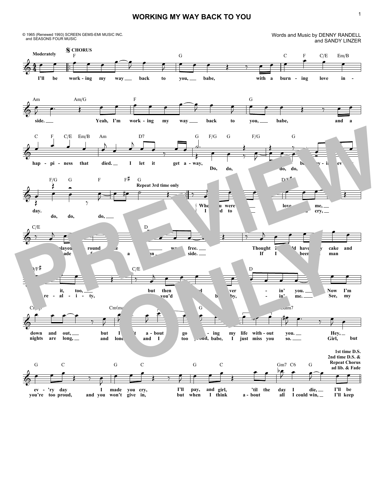 Download or print The 4 Seasons Working My Way Back To You sheet music, chords and digital score arranged for Lead Sheet / Fake Book. This Oldies score includes 1 page(s).