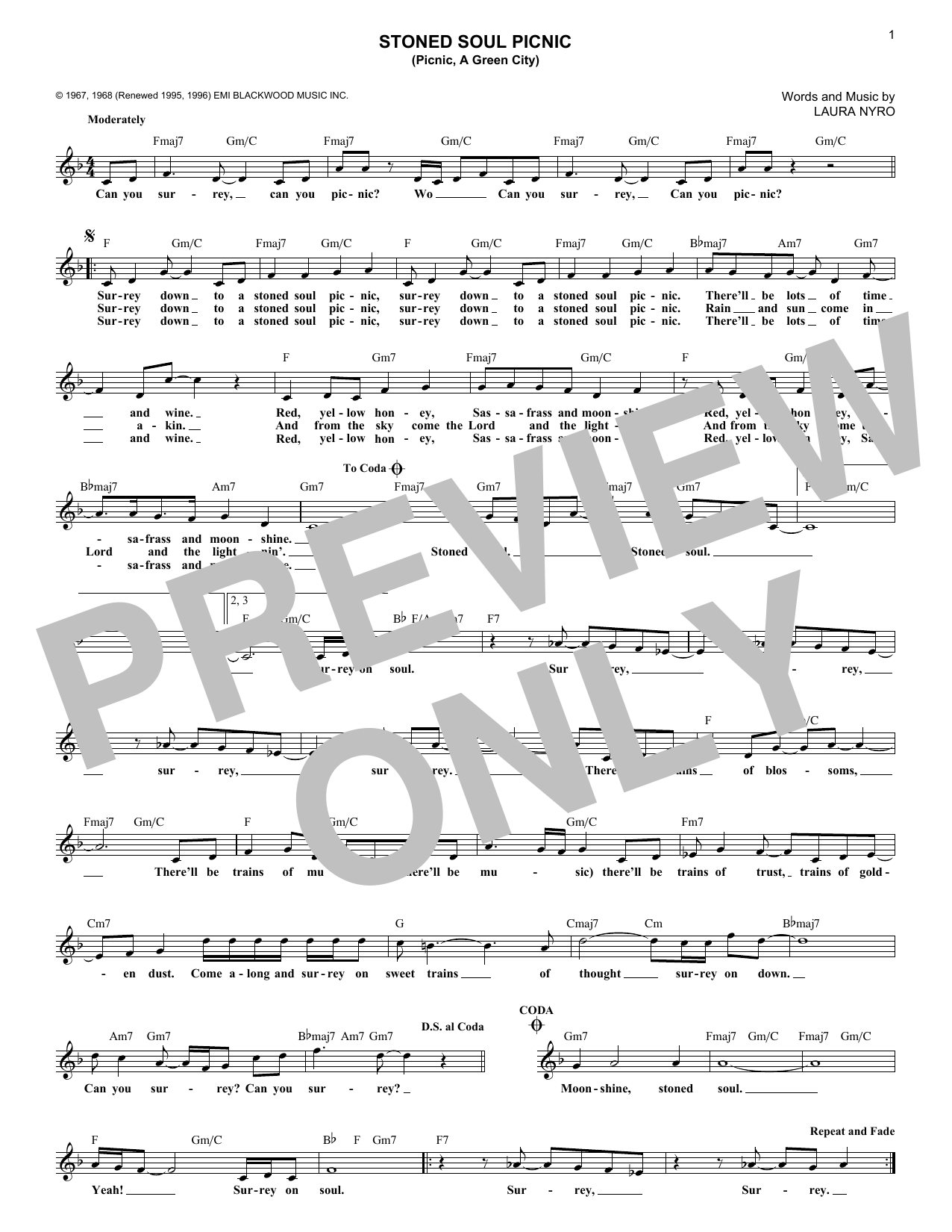 Download or print The 5th Dimension Stoned Soul Picnic (Picnic, A Green City) sheet music, chords and digital score arranged for Lead Sheet / Fake Book. This Pop score includes 1 page(s).
