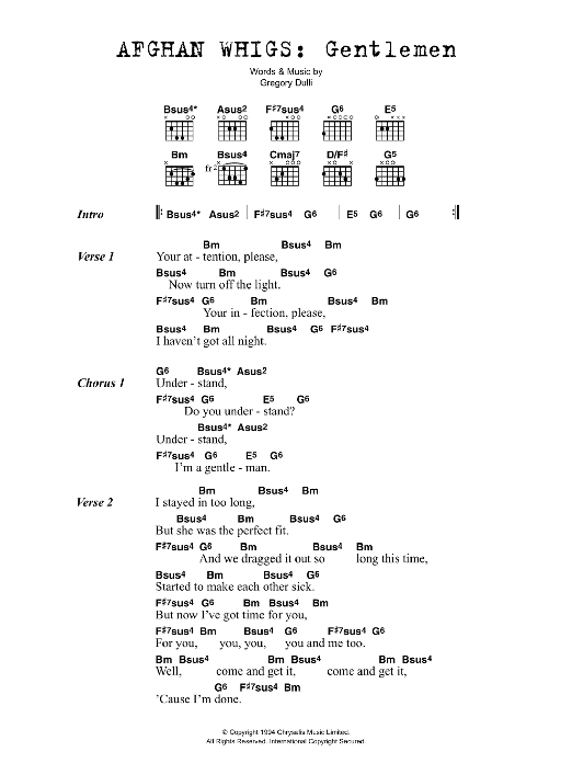 Download or print The Afghan Whigs Gentlemen sheet music, chords and digital score arranged for Guitar Chords/Lyrics. This Rock score includes 2 page(s).
