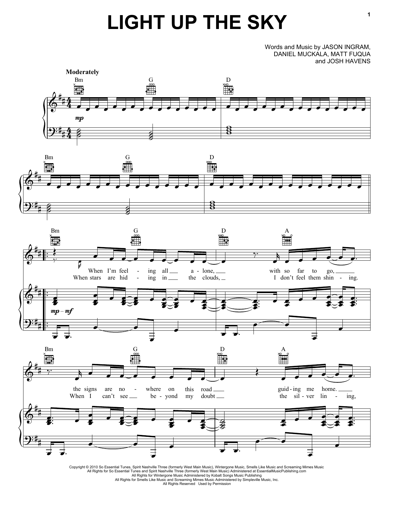 Download or print The Afters Light Up The Sky sheet music, chords and digital score arranged for Piano, Vocal & Guitar Chords (Right-Hand Melody). This Christian score includes 6 page(s).