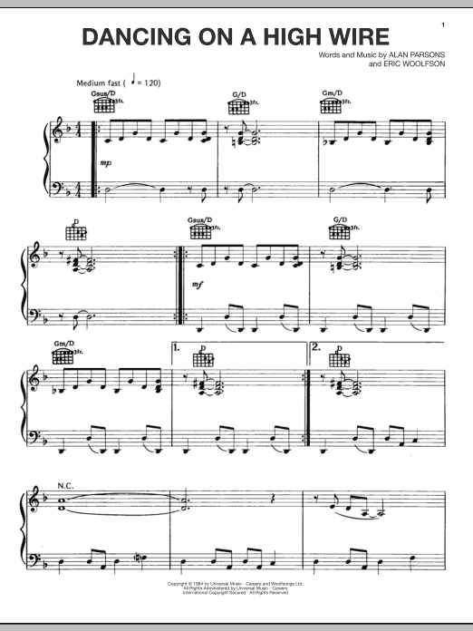 Download or print Alan Parsons Project Dancing On A High Wire sheet music, chords and digital score arranged for Piano, Vocal & Guitar Chords (Right-Hand Melody). This Pop score includes 5 page(s).