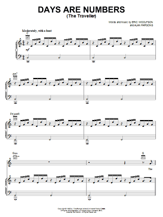 Download or print Alan Parsons Project Days Are Numbers sheet music, chords and digital score arranged for Piano, Vocal & Guitar Chords (Right-Hand Melody). This Pop score includes 5 page(s).