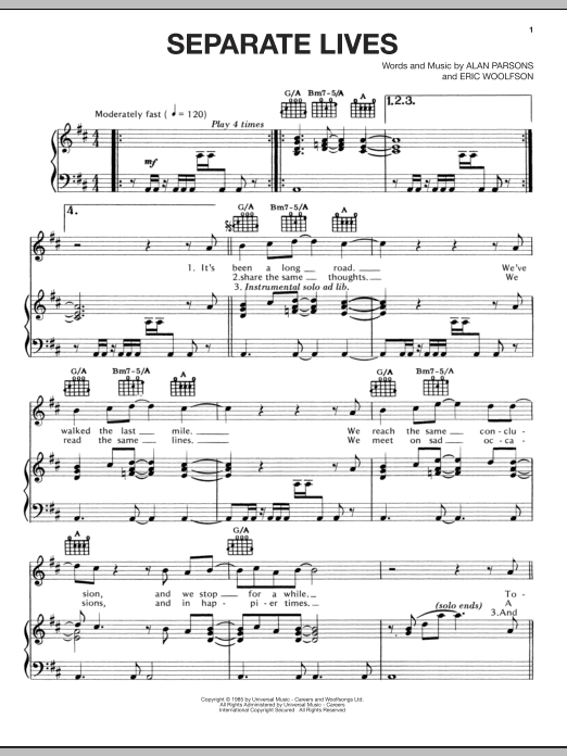 Download or print Alan Parsons Project Separate Lives sheet music, chords and digital score arranged for Piano, Vocal & Guitar Chords (Right-Hand Melody). This Pop score includes 4 page(s).