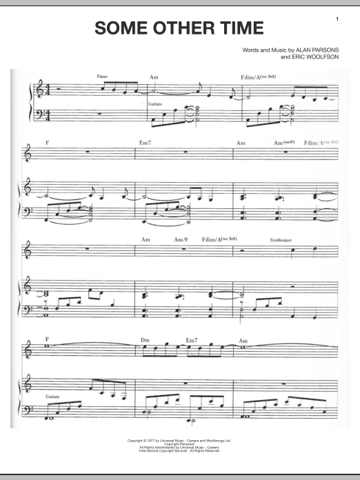 Download or print Alan Parsons Project Some Other Time sheet music, chords and digital score arranged for Piano, Vocal & Guitar Chords (Right-Hand Melody). This Pop score includes 7 page(s).