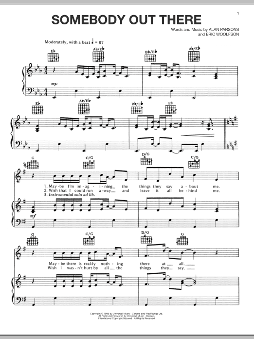 Download or print Alan Parsons Project Somebody Out There sheet music, chords and digital score arranged for Piano, Vocal & Guitar Chords (Right-Hand Melody). This Pop score includes 4 page(s).