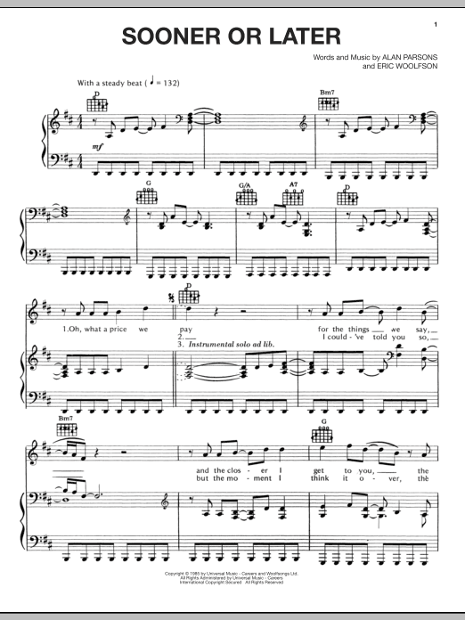 Download or print Alan Parsons Project Sooner Or Later sheet music, chords and digital score arranged for Piano, Vocal & Guitar Chords (Right-Hand Melody). This Pop score includes 4 page(s).