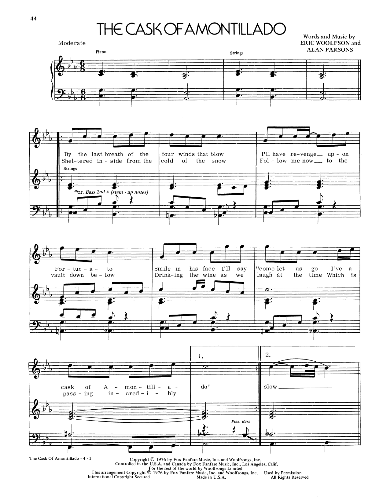 Download or print Alan Parsons Project The Cask Of Amontillado sheet music, chords and digital score arranged for Piano, Vocal & Guitar Chords (Right-Hand Melody). This Pop score includes 4 page(s).