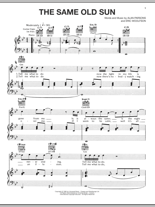 Download or print Alan Parsons Project The Same Old Sun sheet music, chords and digital score arranged for Piano, Vocal & Guitar Chords (Right-Hand Melody). This Pop score includes 4 page(s).