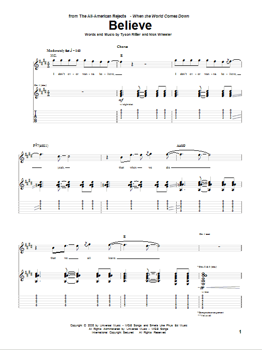 Download or print The All-American Rejects Believe sheet music, chords and digital score arranged for Guitar Tab. This Pop score includes 13 page(s).