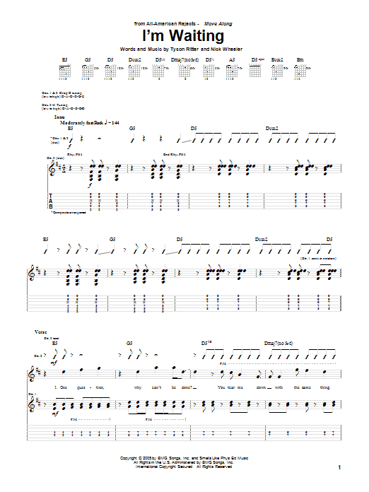 Download or print The All-American Rejects I'm Waiting sheet music, chords and digital score arranged for Guitar Tab. This Pop score includes 9 page(s).
