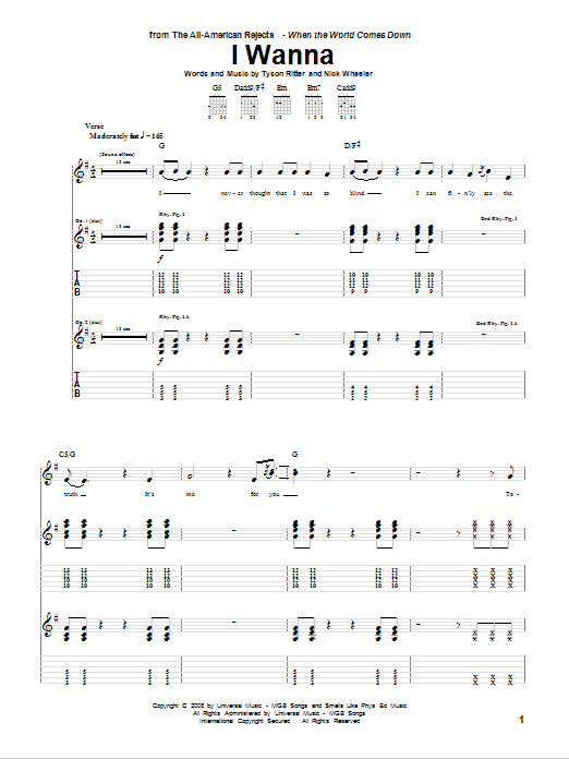 Download or print The All-American Rejects I Wanna sheet music, chords and digital score arranged for Guitar Tab. This Pop score includes 9 page(s).