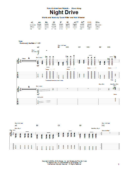 Download or print The All-American Rejects Night Drive sheet music, chords and digital score arranged for Guitar Tab. This Pop score includes 8 page(s).