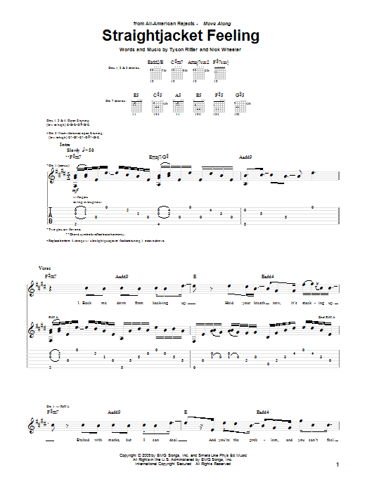 Download or print The All-American Rejects Straightjacket Feeling sheet music, chords and digital score arranged for Guitar Tab. This Pop score includes 7 page(s).