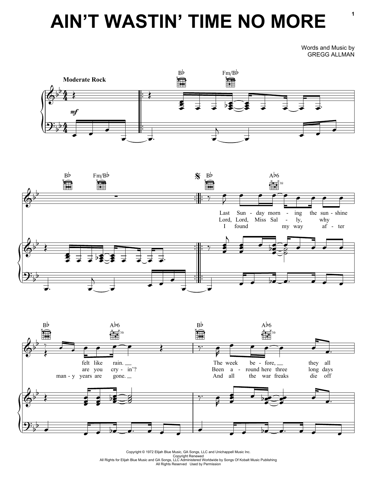 Download or print The Allman Brothers Band Ain't Wastin' Time No More sheet music, chords and digital score arranged for Piano, Vocal & Guitar Chords (Right-Hand Melody). This Rock score includes 5 page(s).