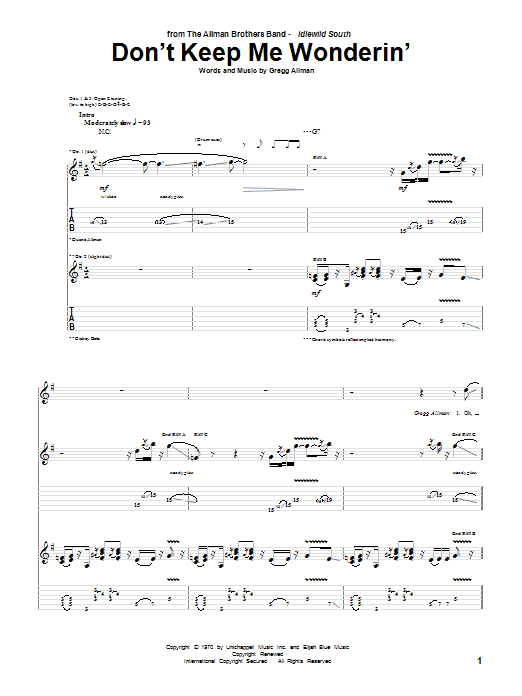 Download or print Allman Brothers Band Don't Keep Me Wonderin' sheet music, chords and digital score arranged for Guitar Tab. This Blues score includes 7 page(s).