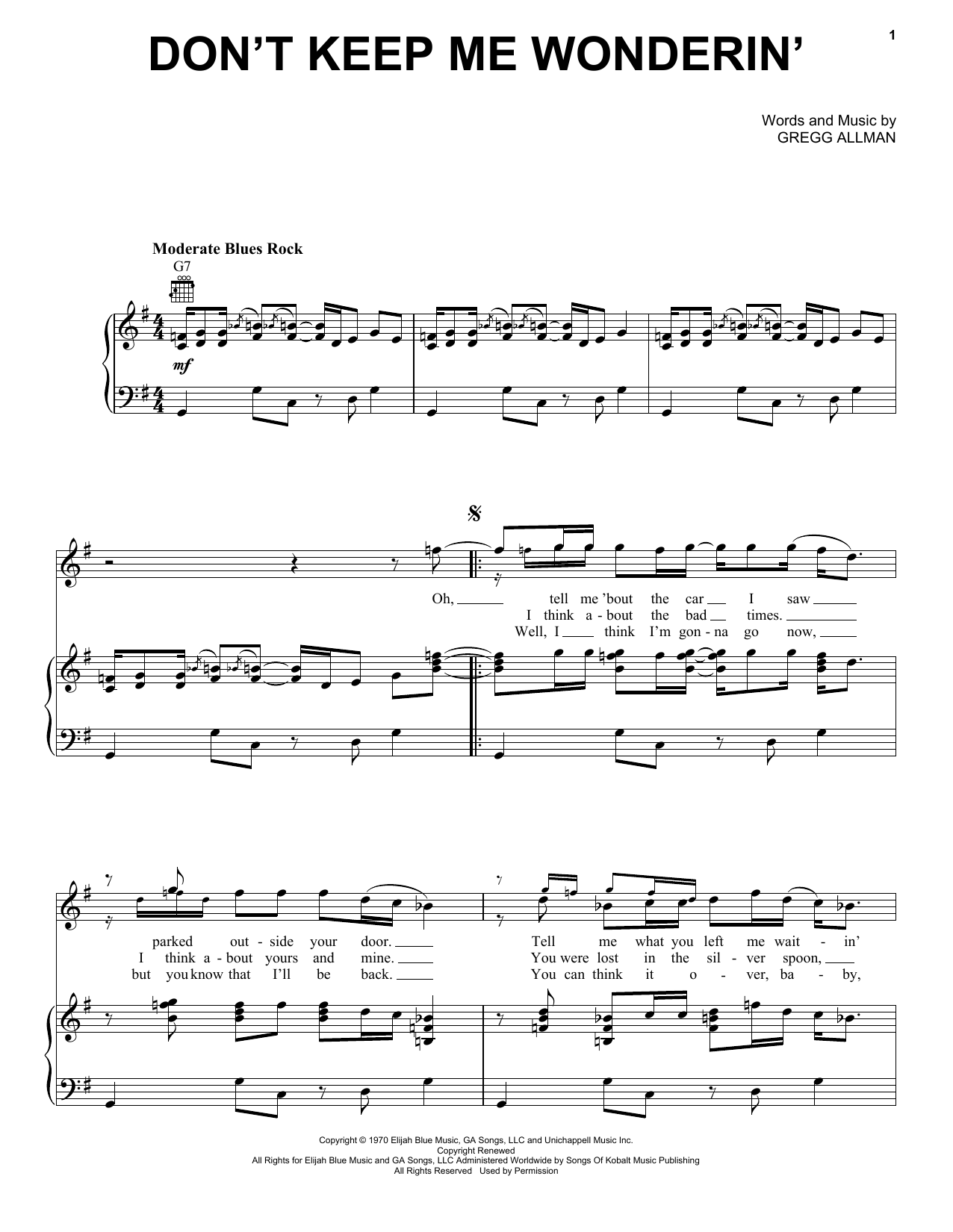 Download or print The Allman Brothers Band Don't Keep Me Wonderin' sheet music, chords and digital score arranged for Piano, Vocal & Guitar Chords (Right-Hand Melody). This Rock score includes 3 page(s).
