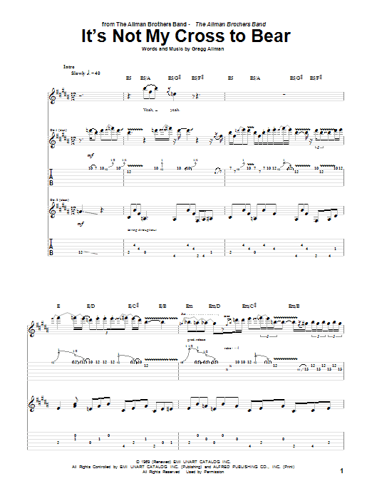 Download or print Allman Brothers Band It's Not My Cross To Bear sheet music, chords and digital score arranged for Guitar Tab. This Blues score includes 10 page(s).