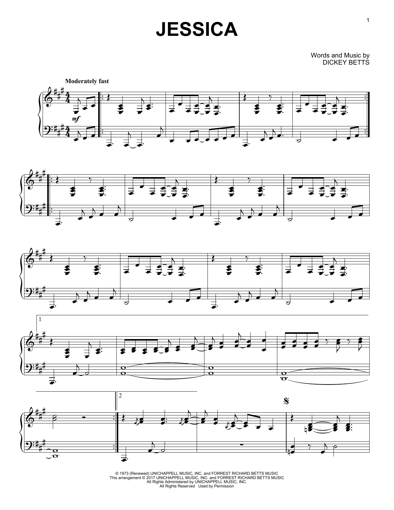 Download or print The Allman Brothers Band Jessica sheet music, chords and digital score arranged for Easy Bass Tab. This Rock score includes 4 page(s).