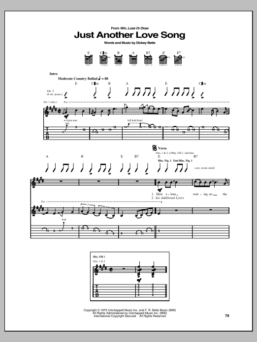 Download or print Allman Brothers Band Just Another Love Song sheet music, chords and digital score arranged for Guitar Tab. This Pop score includes 6 page(s).