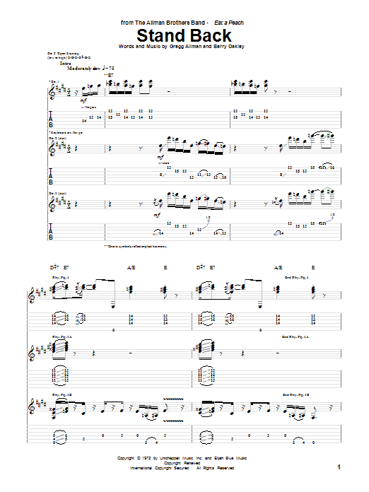 Download or print Allman Brothers Band Stand Back sheet music, chords and digital score arranged for Guitar Tab. This Blues score includes 6 page(s).