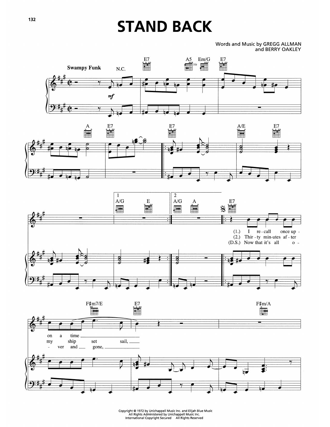 Download or print The Allman Brothers Band Stand Back sheet music, chords and digital score arranged for Piano, Vocal & Guitar Chords (Right-Hand Melody). This Rock score includes 4 page(s).