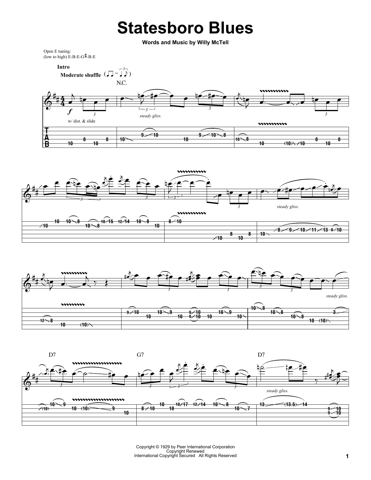 Download or print Allman Brothers Band Statesboro Blues sheet music, chords and digital score arranged for Guitar Tab. This Blues score includes 13 page(s).