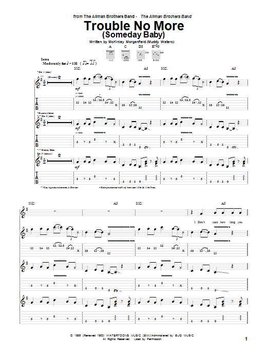 Download or print Allman Brothers Band Trouble No More (Someday Baby) sheet music, chords and digital score arranged for Guitar Tab. This Blues score includes 11 page(s).